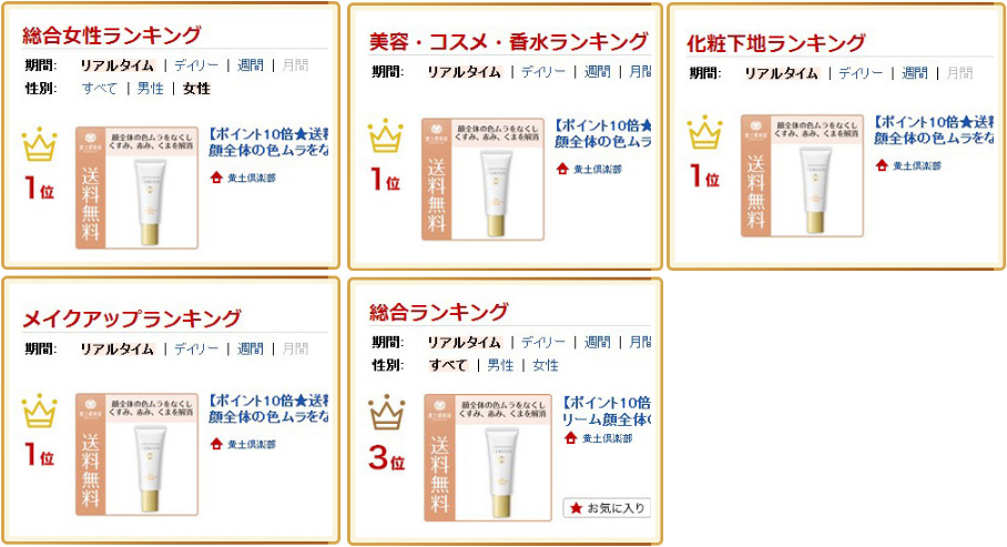 楽天の総合女性ランキング、美容・コスメ・香水ランキング、化粧下地ランキングメイクアップランキングで1位。
