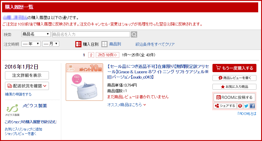 ※楽天ではホワイトニングリフトケアジェルの単品販売は無いですが、旧バージョンのホワイトニングリフトケアジェルのセール品やメビウス製薬等で購入した定期購入以外の商品は以下の画像のように「購入履歴」に載ります。
