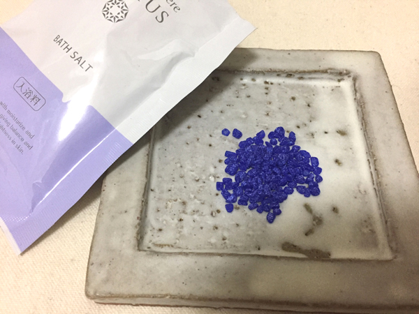 封をあけて、バスソルトを出してみると紺色のような青紫。