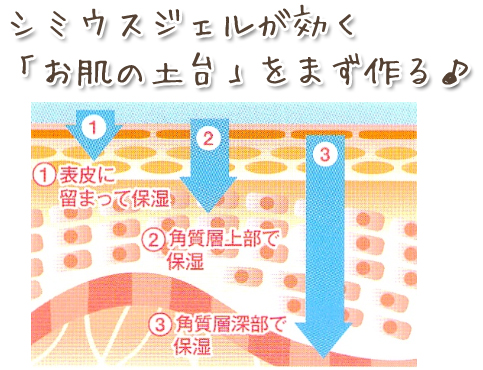 肌の奥、中、表面の3段階で美白成分と潤い成分を届けながらシミウスジェルの有効美白成分もお肌の奥へ。