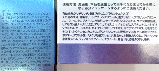 左が朝ジェル、右が通常のシミウスジェルの成分表です。