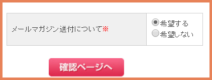 最下部の「メールマガジン送付について」の「希望する」をチェックし「確認ページへ」をクリックします。