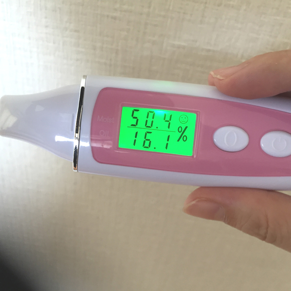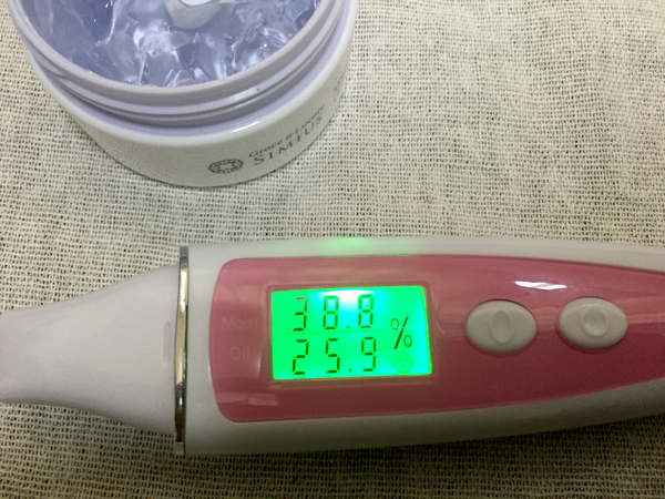 ちなみにメイクをして計測すると計測上では水分量がぐっと下がってしまいますので、今回はメイク無しでジェルのみを塗って測っています。
