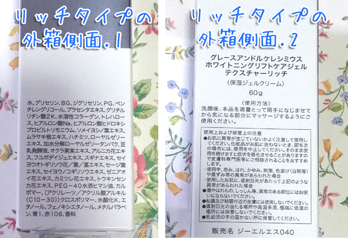 写真の左側がリッチタイプの成分、右側は「保湿ジェルクリーム」との記載や使用方法、注意点が載っています。