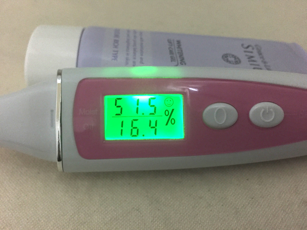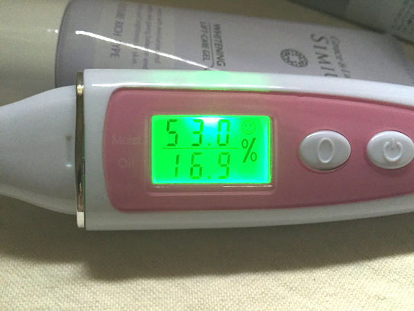 またまたシミウスを塗った後の水分・油分を計測!と同様の方法で、今度はこのシミウス ホワイトニングリフトケアジェル リッチタイプを水分チェッカーで測ってみました。